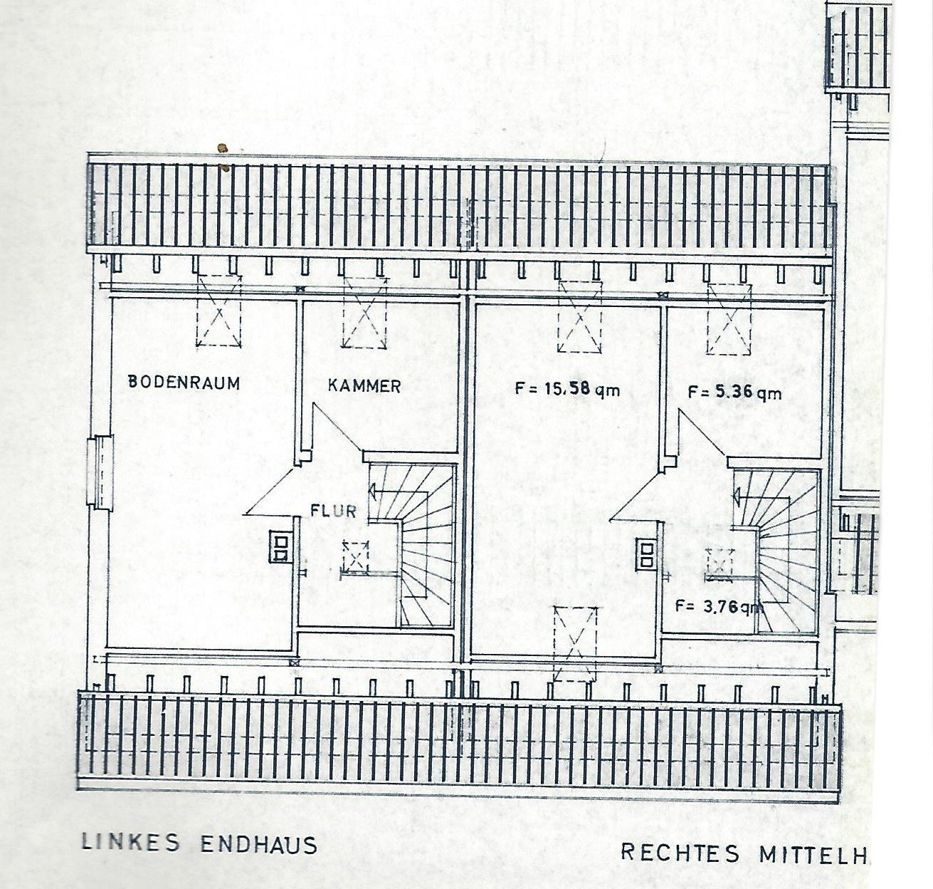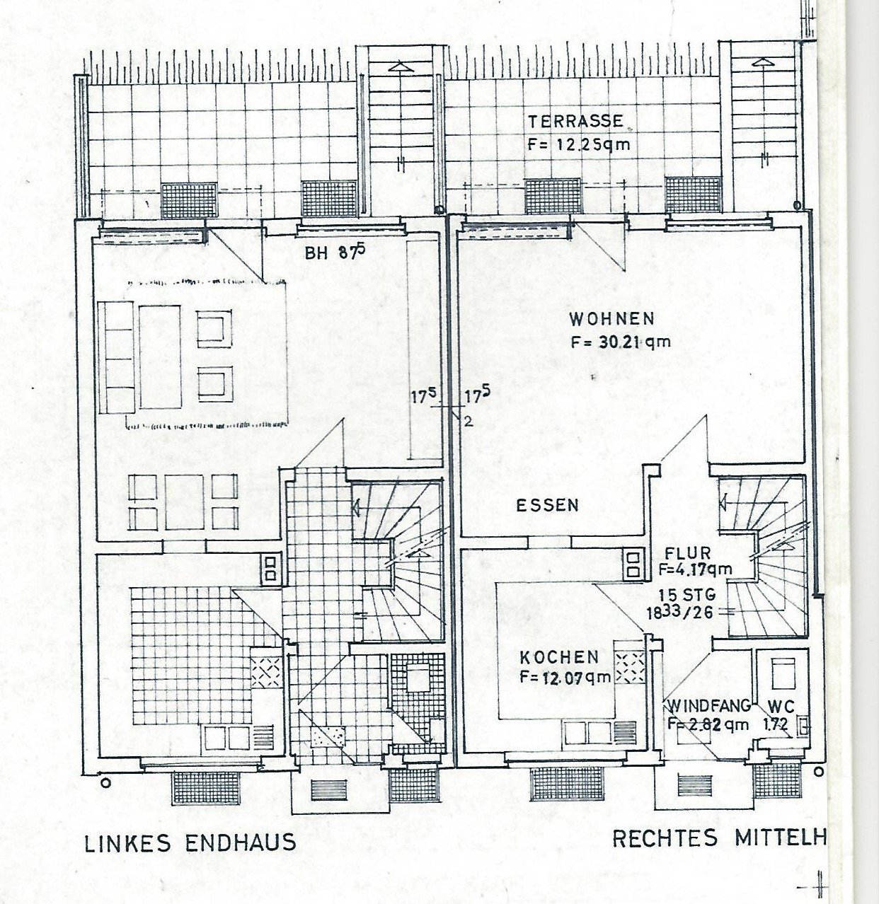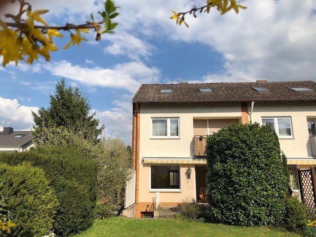 Freundliches Reiheneckhaus aus den 60er Jahren, schöner sonniger Garten, klassischer Grundriss, Wohnzimmer mit Zugang zu Terrasse und Garten, große geschlossene Küche mit Fenster und Gäste-WC im EG, 3 Zimmer und Bad im 1. OG, 2 Zimmer und ein Gäste-WC im DG. Das Haus ist unterkellert und hat eine Einzelgarage.